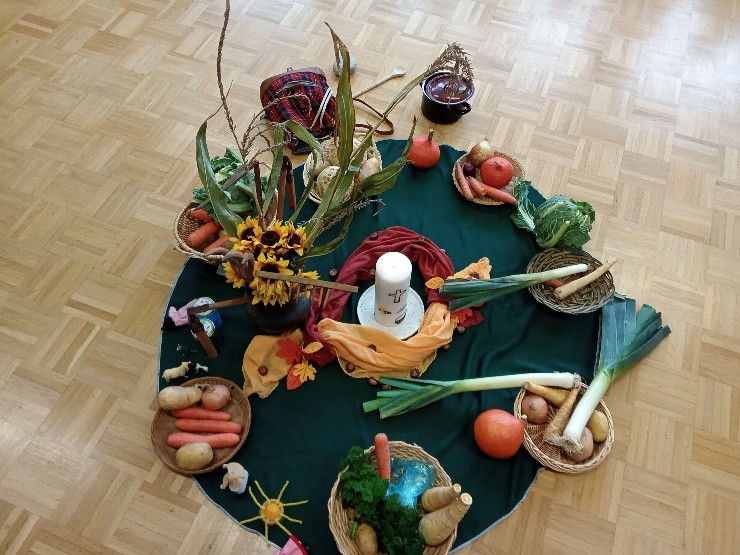 Am 08.Oktober 2025 feierten alle Kinder des Kindergartens einen Wortgottesdienst zu Erntedank in unserem Gemeinschaftsraum. Mit Erntedankliedern und einer Geschichte von der geheimnisvollen Steinsuppe haben wir uns eingestimmt. In der Geschichte ist ein armer Wanderer in ein Dorf gekommen und hat nach einem Topf mit Wasser gefragt um sich eine Steinsuppe kochen zu können. Nach und nach kamen die Dorfbewohner zu dem Wanderer am Feuer und brachten was sie noch zu Hause an Gemüse hatten: eine Zwiebel, eine Kartoffel, eine Karotte, usw. Wie in der Geschichte brachte jedes Kindergartenkind Gemüse mit in den Kindergarten mit diesen Gaben ist in unserer Mitte ein bunter und reich geschmückter Erntedankaltar entstanden. Aus diesen Zutaten kochten wir gemeinsam eine leckere Suppe – natürlich ohne Steine, die wir gemeinsam gegessen haben.