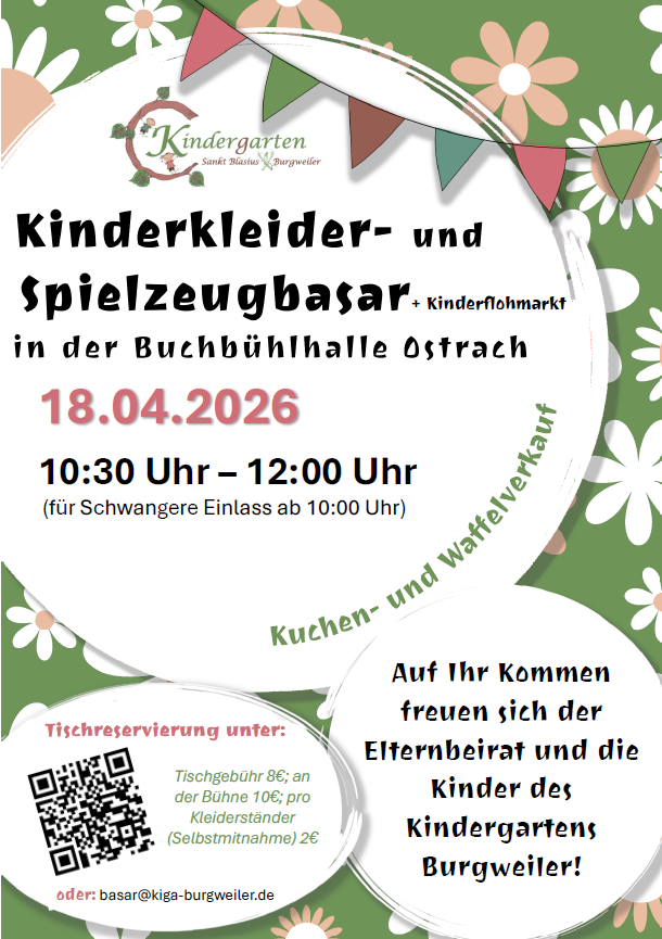 Zweimal im Jahr – im Frühjahr (März/April) und im Herbst (September/Oktober) – veranstaltet der Elternbeirat des Kindergartens St. Blasius in Burgweiler einen beliebten Kinderkleider- und Spielzeugbasar (Selbstverkäufer) in der Buchbühlhalle in Ostrach.